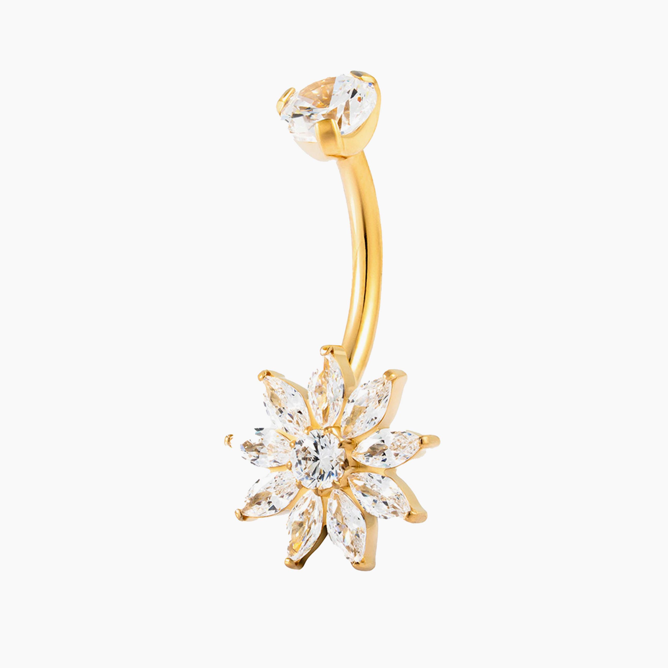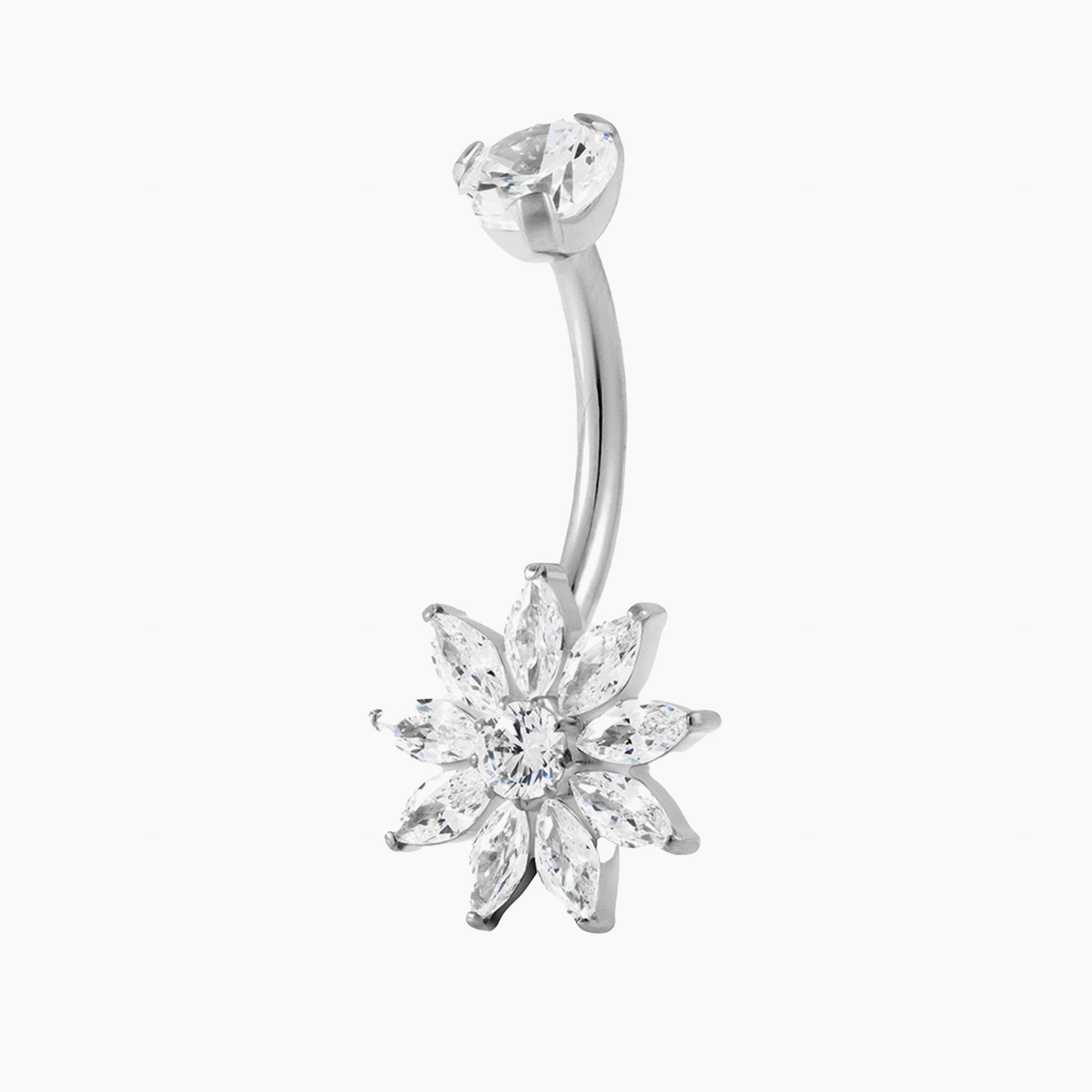 Titanový piercing do pupíku s vnitřním závitem Camelia. Jemný a romantický šperk s květinovým motivem, který evokuje přírodní krásu a svěžest. Jeho detailní provedení dodává eleganci a harmonii každému vzhledu.
