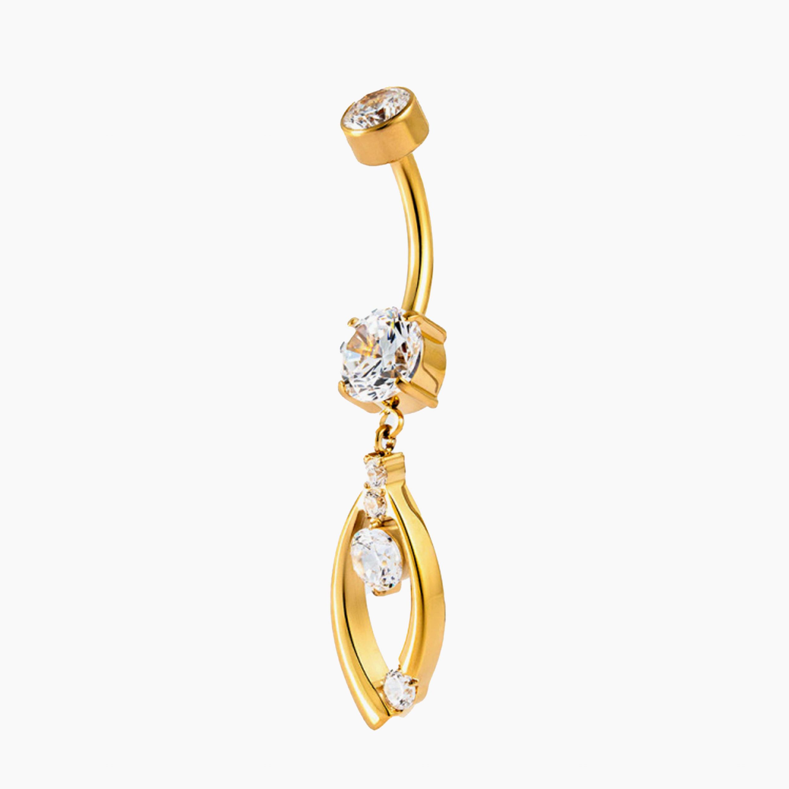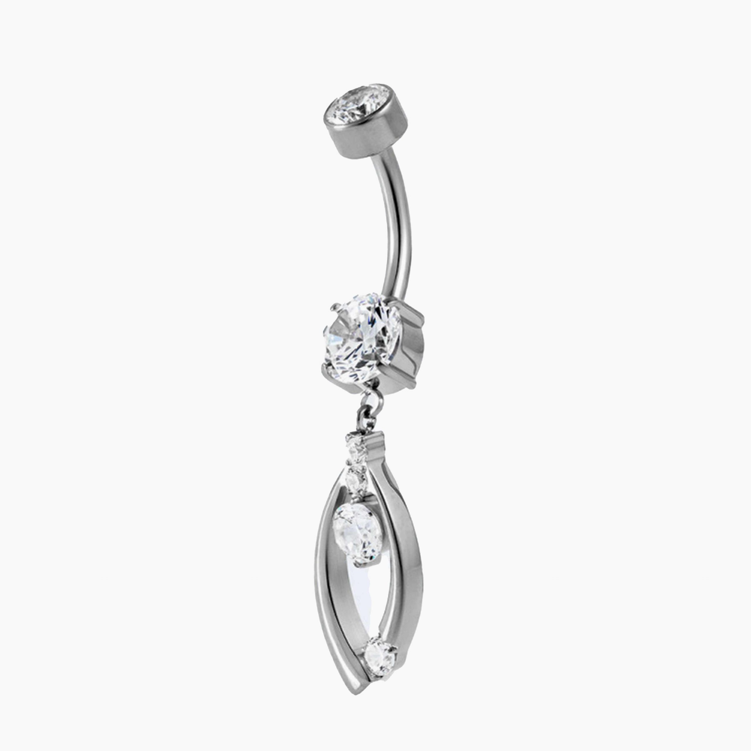 Titanový piercing do pupíku s vnitřním závitem Eva. Elegantní a ženský šperk zdobený třpytivými zirkony, které krásně odrážejí světlo při každém pohybu. Jeho sofistikovaný design s jemně zavěšeným kamenem dodává bříšku nádech luxusu a smyslnosti.