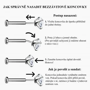 Bezzávitové šperky fungují na principu zasunutí koncovky do duté tyčinky. Koncovka má jemně ohnutý trn, díky kterému drží pevně na místě.